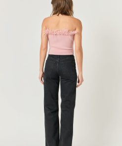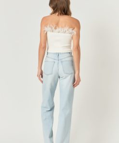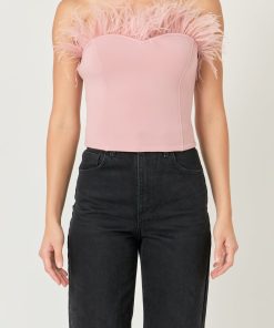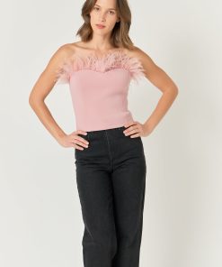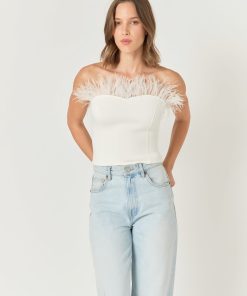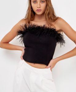 Show off your stylish side with this strapless knit top. This feather-print top is fitted giving you an effortless hourglass shape. It will stylishly have you ready for anything the day throws your way. This top is perfect for any special occasion, have a perfect evening with friends or a romantic night out with your special someone.