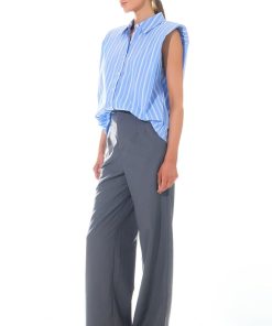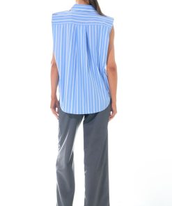 Introducing the Stripe Power Shoulder Shirt the perfect blend of style and power. This collared shirt features bold stripes that demand attention while sleeveless design keeps you cool and comfortable. The real game changer? Shoulder pads that add structure and edge to your look. Made with high-quality fabric this shirt is a must-have for any wardrobe. Whether you’re headed to the office or a night out turn heads with this statement piece. Elevate your style and feel empowered with the Stripe Power Shoulder Shirt.