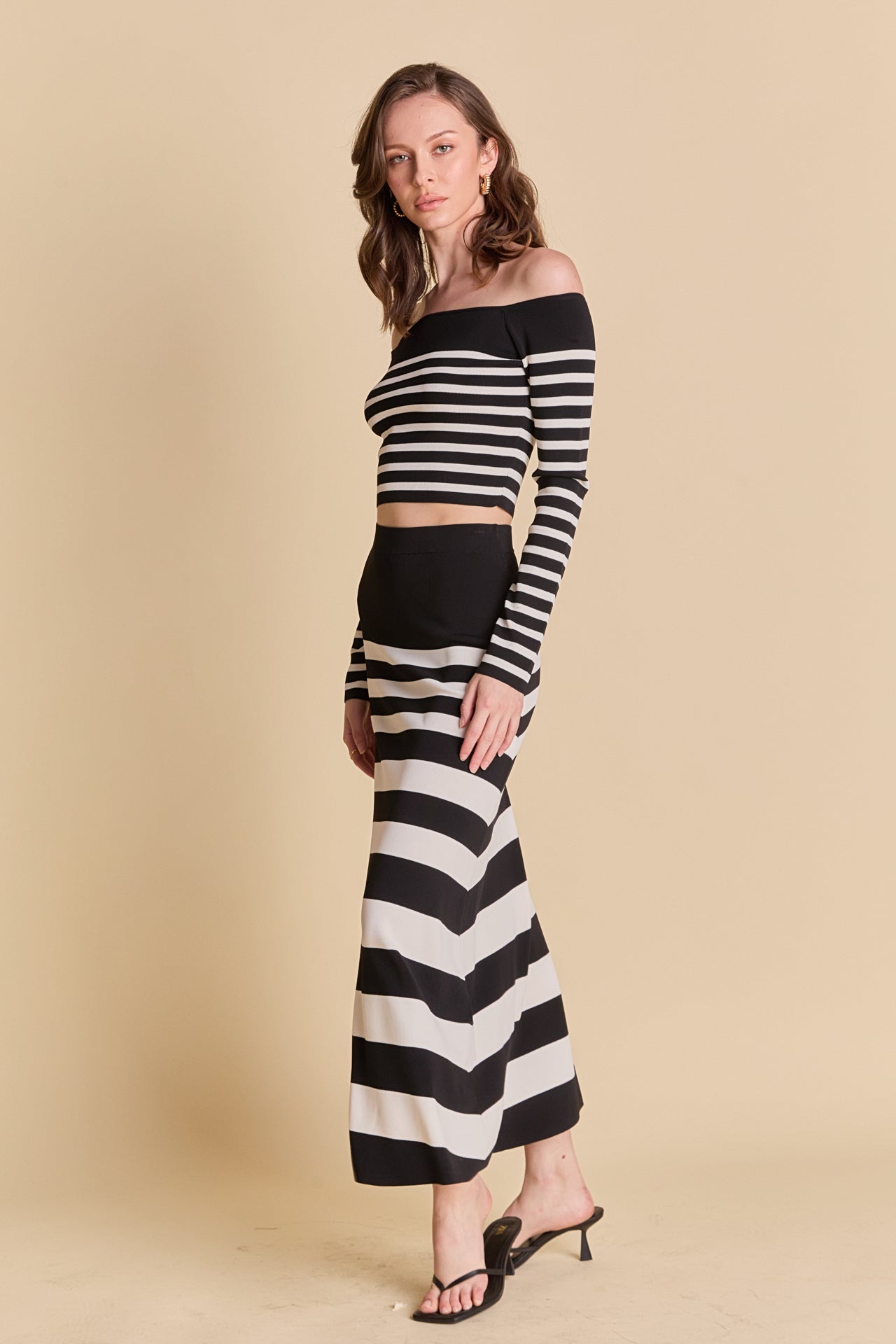 Step into style with our Striped Midi Skirt. The flattering fit and flare silhouette delivers comfort and definition, while the knit fabric offers a soft and lightweight feel. Its midi length adds a touch of sophistication, perfect for both casual and formal occasions. With classic stripes that add a timeless charm to your wardrobe, this skirt is versatile and easy to style. Shop now and make a fashion statement with ease.