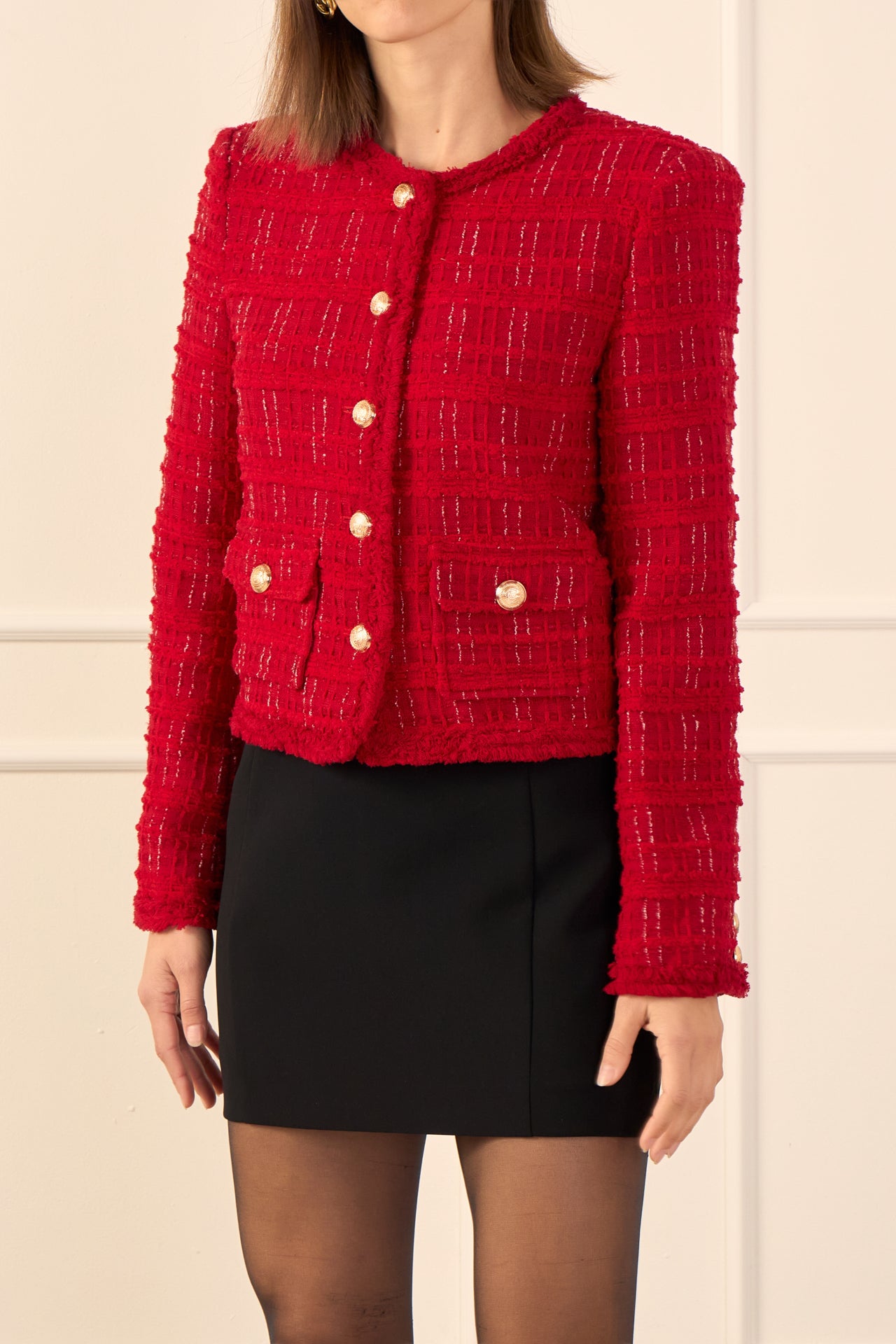 Upgrade your jacket game with our Tweed Buttoned Blazer. Made with high-quality tweed, this blazer has a timeless appeal with its classic front buttons and front pockets. The structured silhouette is further enhanced with shoulder pads, giving a sleek and polished look. Perfect for both formal and casual occasions, this blazer adds a touch of sophistication to any outfit. You’ll stand out in the crowd with this must-have wardrobe staple. Shop now and elevate your style with our Tweed Buttoned Blazer.